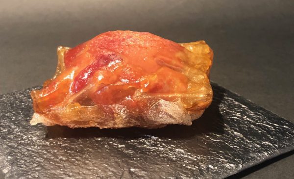 Ahate konfit erregosia fruitu gorriekin eta laranja esentziarekin, kristal ogiaren gainean kinoa haziekin zipriztinduta