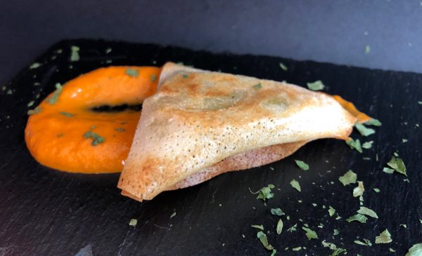 Triangulito relleno de puerro con gamba, soja de naranja y salsa romescu