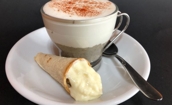 Crema de setas y champiñones con espuma de queso acompañado de un canutillo de bechamel con langostino y merluza