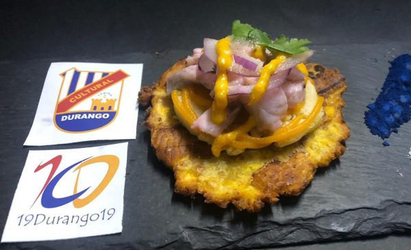 Crujiente de plátano con tamal de maíz dulce, puré de boniato y pescado blanco macerado con jugo de limón y salsa de ají amarillo