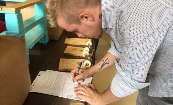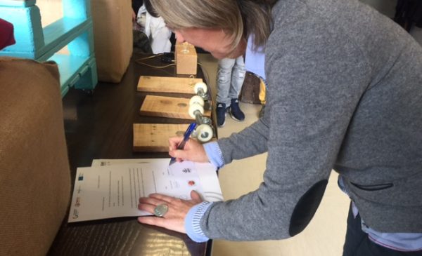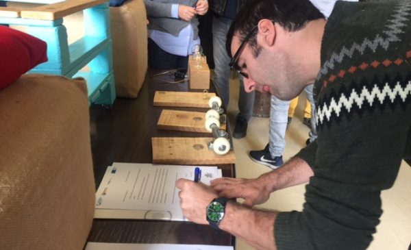Para la ocasión han firmado un acta en el que los representantes de la empresa, Ismael como presidente, Asier Ordorika como orientador y responsable del programa y Covadonga Noval como representante de Jaed, plasmaban el acuerdo por el cual Hexakoop cedía dos pufs, una mesa de mesa, dos colgadores y un llavero.