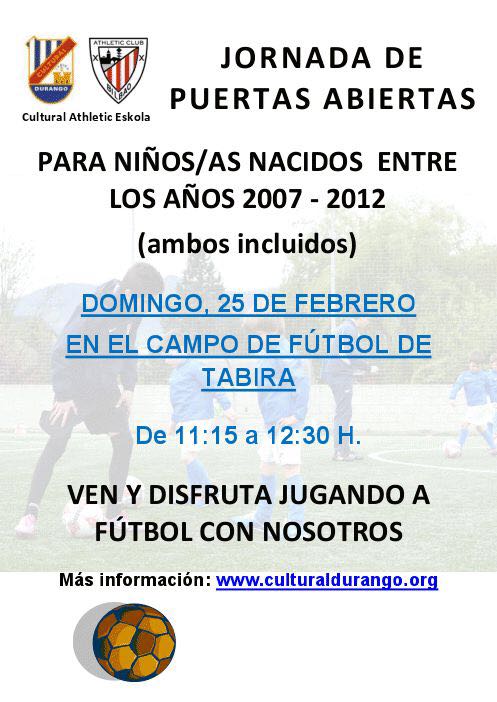 DOT KIROLAK.- La Cultural de Durango y Athletic Eskola han organizado para este domingo, 25 de febrero, una jornada de puertas abiertas para los niños y niñas nacidos desde 2007 hasta 2012. El horario será desde las 11:15 hasta las 12:30 horas en Tabira. Desde el club durangarra animan a tomar parte y conocer de cerca su funcionamiento.