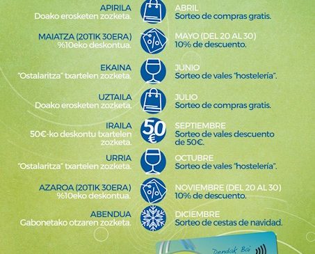 DURANGO.- La asociación Dendak Bai ha dado a conocer el programa de las nuevas campañas de la Durango Txartela para el 2021. La Durango Txartela sigue siendo una tarjeta de crédito totalmente gratuita que ofrece beneficios tanto para el establecimiento adherido como para los clientes que la utilizan.