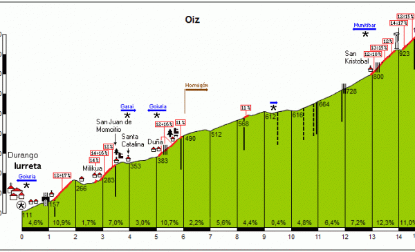 Se trata de una subida, desde Iurreta, de 14,73 kilómetros aempezando a 110 metros sobre el nivel del mar y terminando a 1.003. Es una ascensión irregular, con varios tramos suaves y de descanso, siendo los últimos dos kilómetros los más exigentes: 12,3% y 11%. En la primera mitad, el segundo kilómetro es al 10,9% y el sexto al 10,7%. En total, serán 892 metros de desnivel.