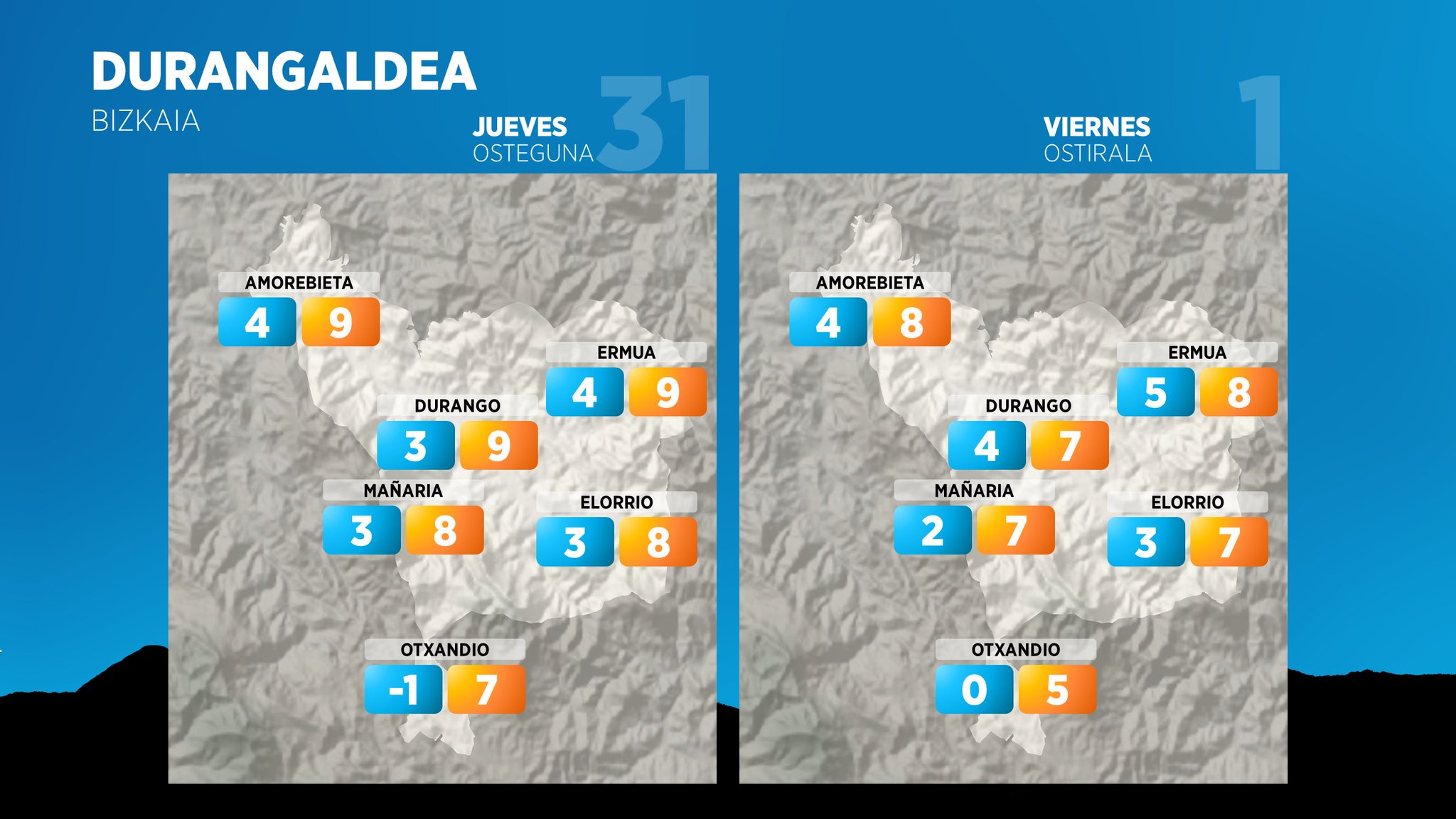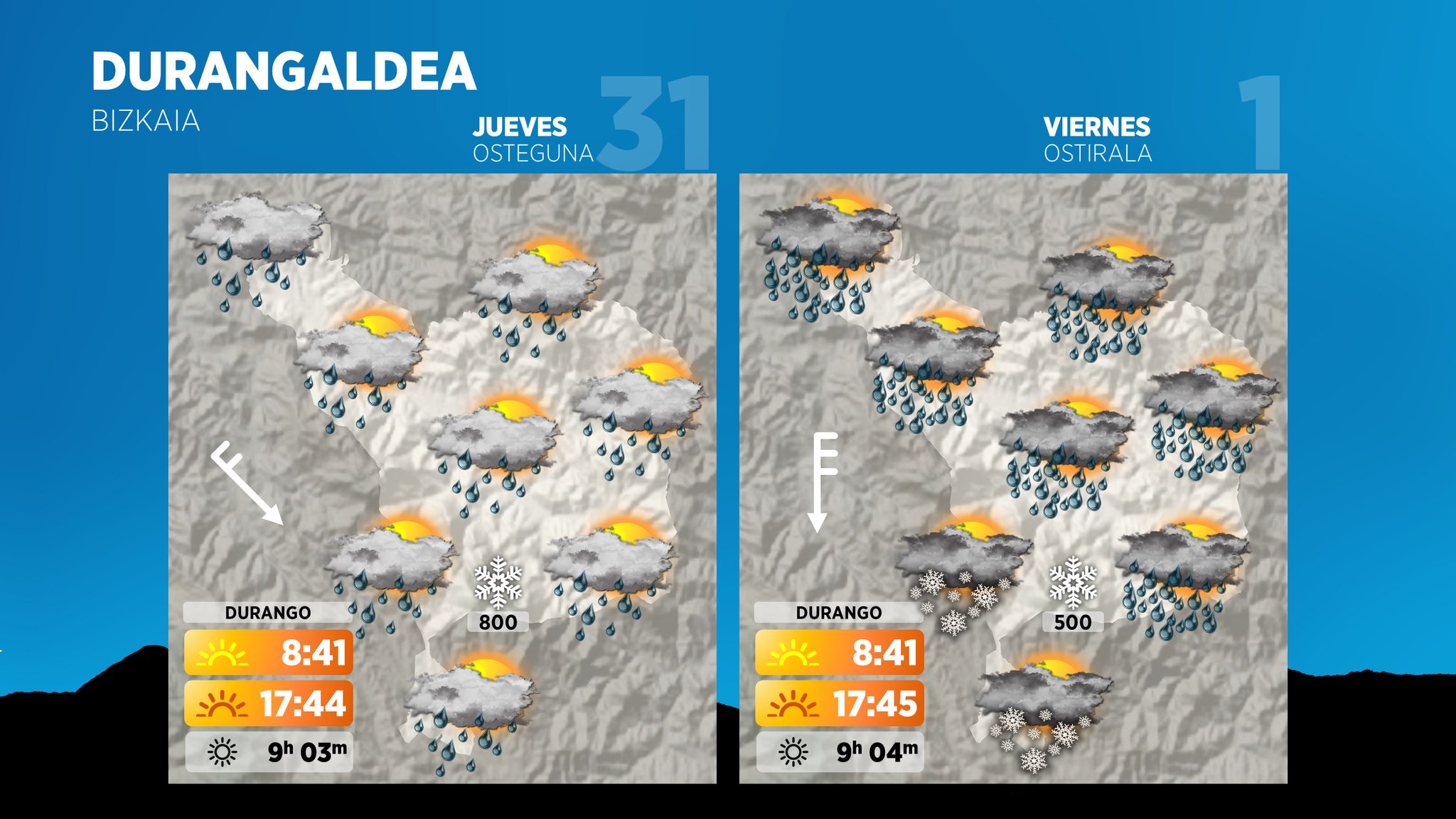Según Euskalmet, el 31 de diciembre se espera una cota de nieve estimada entre los 1000-1200 m durante la primera mitad del día que irá descendiendo a lo largo de la tarde hasta situarse al final de la jornada sobre los 500-600 m, con acumulados estimados en 10 cm a 1000 m de altitud y en 2 cm a 600 m durante la noche