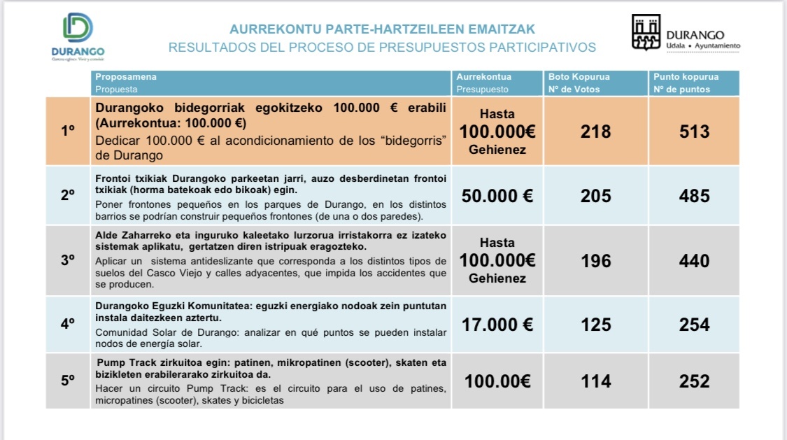 DURANGO.- El Ayuntamiento de Durango ha concluido sus terceros Presupuestos Participativos con la participación de 1.695 vecinos y vecinas de la localidad, en el que la opción más votada ha sido el acondicionamiento de los bidegorris con 218 votos de apoyo y 513 puntos. Las siguientes opciones más votadas han sido construir pequeños frontones en distintos barrios de la localidad, que ha obtenido 205 votos y 485 puntos y aplicar un sistema antideslizante que corresponda a los distintos tipos de suelos del Casco Viejo y calles adyacentes, con 199 votos y 440 puntos.