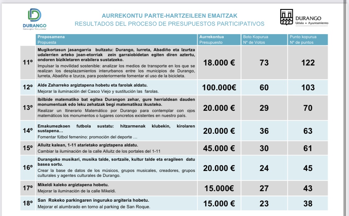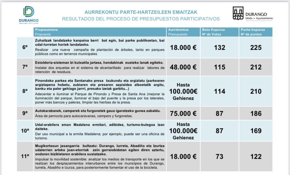 Durante el mes de junio de 2021 se han publicado en la página web partehartu.durango.eus, las propuestas que habiendo pasado a la fase de votación el año pasado, no lograron la puntuación suficiente para ser incluidas en el presupuesto.