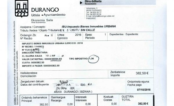 DURANGO.- Siguen las denuncias y visitas al SAC -Servicio de Atención al Ciudadano- de Durango, de muchos vecinos que acuden al Ayuntamiento pensando que el cobro de un importe tan elevado del recibo del IBI se trata de una confusión. «Yo no me podía creer, el año pasado pagué 382 euros y este me han subido más de un 400% y he pagado 1.633 euros», denuncia un lector de DOT con una local situado en la calle Olleria. Otro vecino con un local en Landako Etorbidea insiste en el mismo mensaje, «a mi me han subido de 600 euros a más de 2300 euros». Estos dos vecinos, junto a muchos otros, han acudido a pedir respuestas en el SAC y «la respuesta ha sido que pongamos una reclamación».