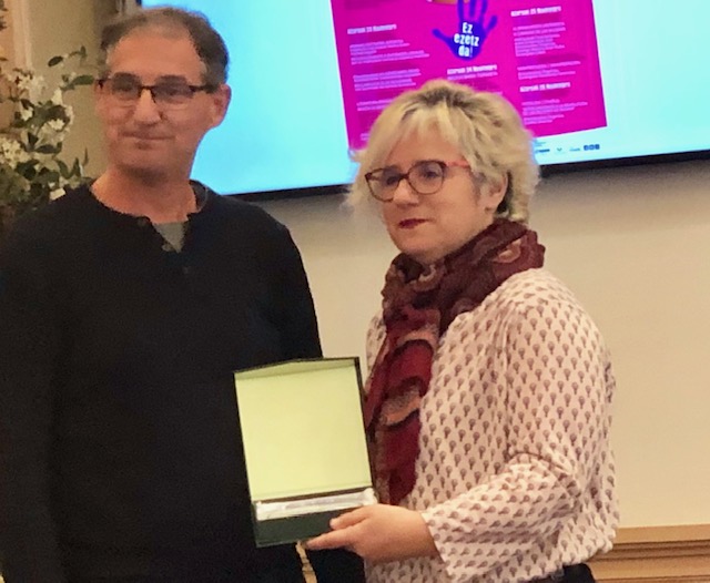 Minutos antes, la alcaldesa de Durango, Aitziber Irigoras, y la teniente alcalde, Pili Ríos, han entregado los distintivos a cinco agrupaciones por el trabajo que desempeñan contra la desigualdad y la violencia machista. San Antonio Ikastetxea, la Ikastola Kurutziaga, el Ezkurdi KT, Ibaizabal Eskubaloi Taldea y el servicio de pediatría de Landako han sido reconocidos esta mañana.