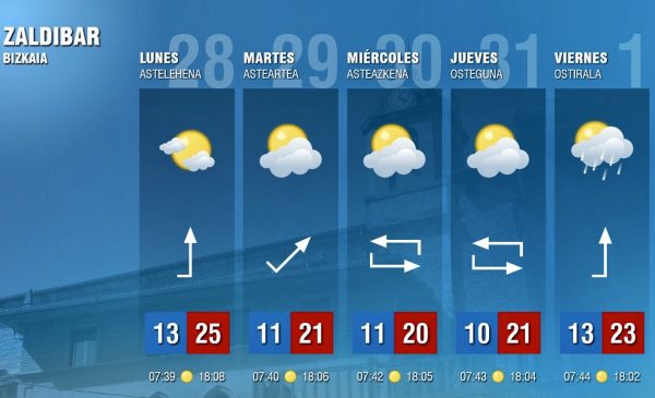 EGURALDIA.- Al igual que el fin de semana, los próximos días se presentan muy tranquilos, con ausencia de lluvia, nubes y claros y temperaturas muy agradables, pudiendo llegar hasta los 25 grados durante muchos días de la semana. Un situación de estabilidad que se mantendrá hasta el viernes, cuando todo hace indicar que llegará el cambio con la entrada de una borrasca que dejará para el fin de semana lluvias y temperaturas más bajas.