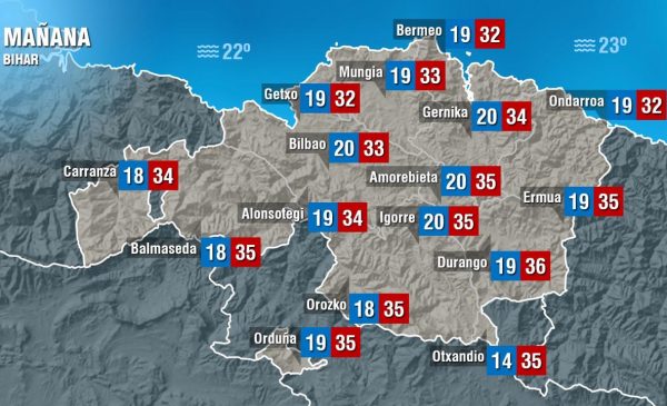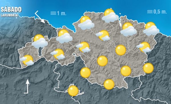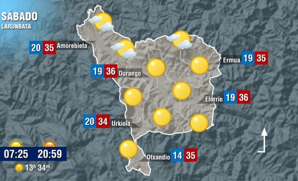 EGURALDIA.- El sol y el calor serán los protagonistas durante los dos próximos días. Aunque las temperaturas míninas serán frescas, en torno a 14 grados, las máximas llegarán a pasar los 35 en algunos momentos del día. Por lo tanto, tanto el viernes como el sábado se presenta con cielos despejados y un sol que brillará y calentará. Una situación que contrastará con la del domingo, y es que el sábado a la noche las nubes irán ganando terreno hasta cubrir los cielos, además el viento girará al nordeste y eso hará que las temperaturas bajen de un forma acusada. Es decir, si el sábado se queda en torno a los 35 o 36 grados, el domingo bajarán diez grados, quedando en 25 y con posibilidad de lluvias.