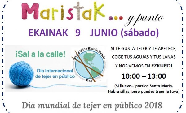 DURANGO.- Este sábado se celebra el Día Internacional de Tejer en Público, por ese motivo desde Maristak han organizado un acto desde las diez de la mañana hasta a una de la tarde, que consiste en llevar las agujas, las lanas y tejer en la plaza Ezkurdi de Durango . «Si te gusta tejer y te apetece, coge tus agujas y tus lanas y nos vemos en Ezkurdi», señalan desde Maristak. En caso de lluvia informan que el acto se celebrará en el pórtico de Santa María. «¡Sal a la calle!», animan.