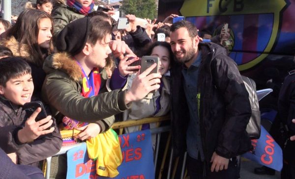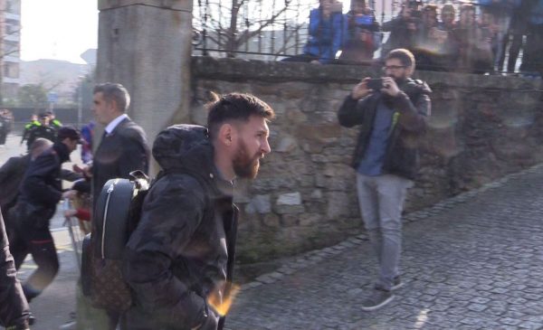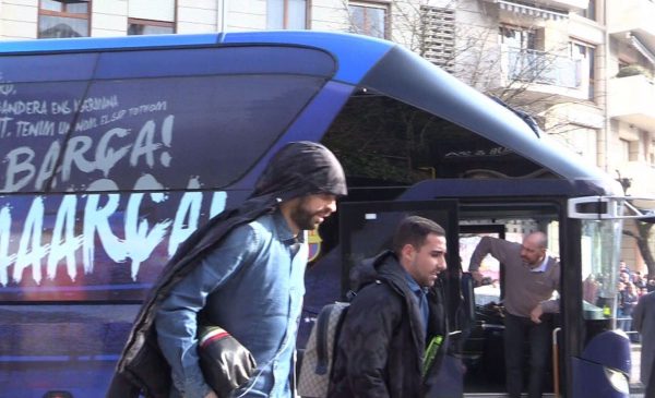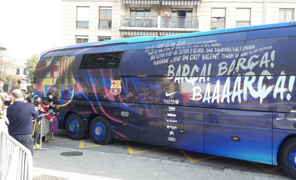 DOT KIROLAK.- Antes de lo previsto el Barça aterrizaba en el aeropuerto de Loiu y sobre las 12:25 horas llegaban a Durango. Desde ayer la expectación era máxima y más cuando esta noche llegaba el bus. Muchas personas han sido las que se han acercado a inmortalizar el bus culé. Aunque el momento de mayor tensión ha sido cuando han llegado los jugadores. Ante una gran presencia policial y escoltados por la Ertzaintza llegaban los jugadores. Para esa hora decenas de personas se agolpaban en la calle.