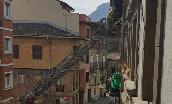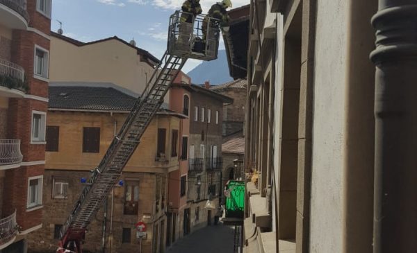 DURANGO.- Varios cascotes se han desprendido esta mañana de uno de los edificios situados en la calle Goienkale, casi en la plaza de Santa Ana. Sobre las doce del mediodía una patrulla de la Policía Municipal acudía a acordonar la zona y ha alertado a los bomberos del parque de Iurreta que acudían a la citada calle minutos antes de la una de la tarde. Por espacio de una hora han estado retirando los cascotes caídos y también han revisado la cornisa del edificio para evitar nuevos desprendimientos.