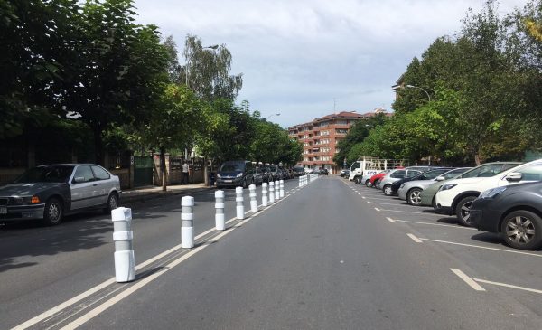 ZUREDOT.- Un lector nos envía esta denuncia a través del Canal de DOT de Whatsapp 656182430, «De un tiempo a esta parte, el Ayuntamiento de Durango ha hecho varias supuestas mejoras que no voy a entrar a valorar; por un lado se ha aprovechado el verano para colocar pivotes en varias calles, en la separación entre carril de circulación derecho e izquierdo, pienso que para evitar las dobles filas en lugares concretos y el peligro que conlleva adelantar a un vehículo de estos invadiendo el carril contrario, como por ejemplo ocurre en San Roke kalea en horario escolar… y por otro lado, y es aquí de donde sale mi denuncia…, se ha cambiado el sentido de estacionamiento en las zonas de aparcamiento en batería y esta última conlleva un dato negativo para el viandante… Se nos ha restado más de medio metro en las aceras y carriles bicis… Hay en lugares en los que no importa debido a que la acera es lo suficientemente ancha pero por poner un ejemplo en una de las calles de las imágenes, la calle Zabale, de tránsito considerable en horario escolar, no estaría demás ir colocando topes como ya se ha hecho en algún otro lado e impedir que los vehículos invadan ese espacio, permitiendo la libre circulación de peatones, carros de bebés y demas…