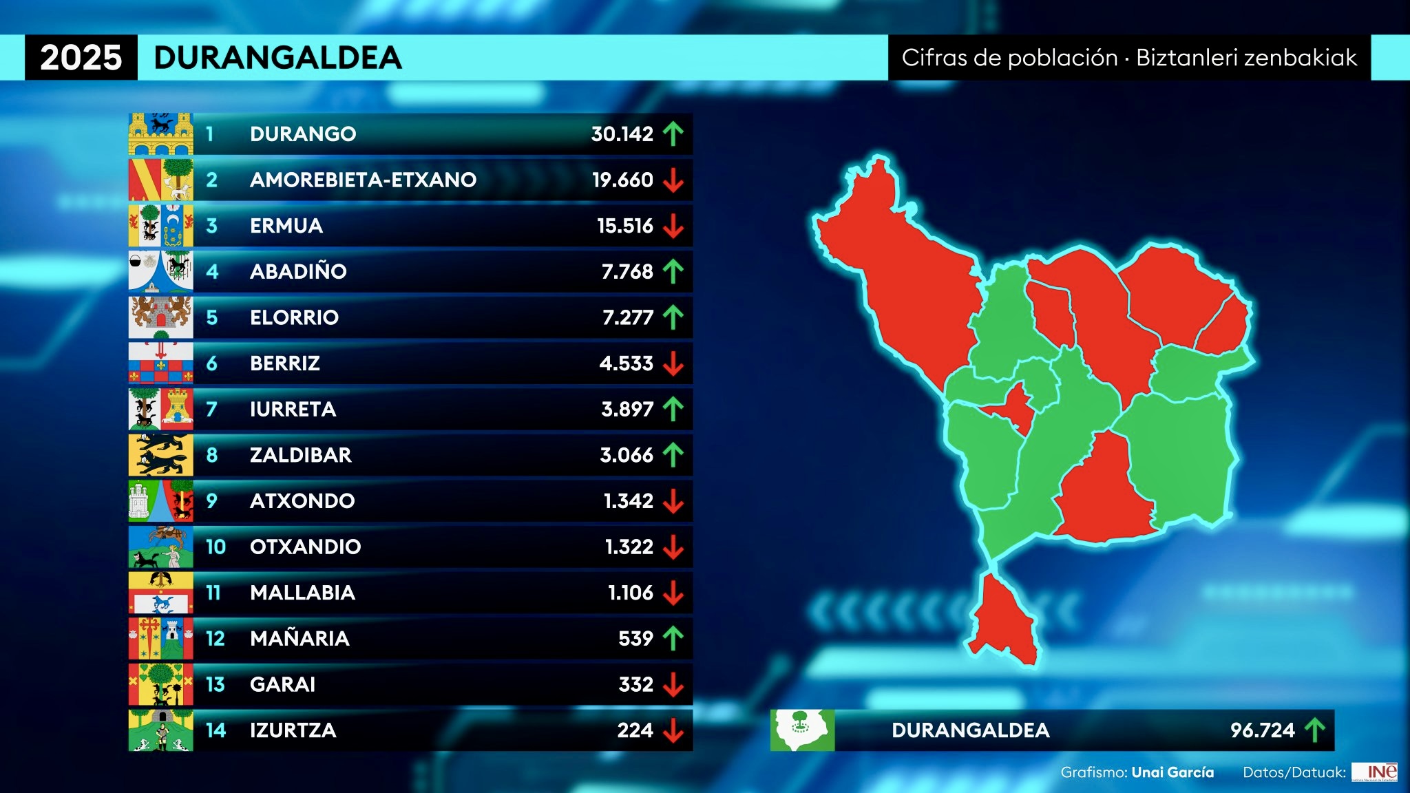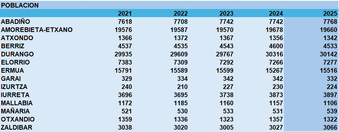 DURANGALDEA | La comarca de Durangaldea alcanzaba los 96.724 habitantes a 1 de enero de 2025, según los datos oficiales publicados por el Instituto Nacional de Estadística (INE). La cifra global refleja una evolución desigual entre los municipios de la comarca, con incrementos poblacionales en varias localidades y descensos en otras.