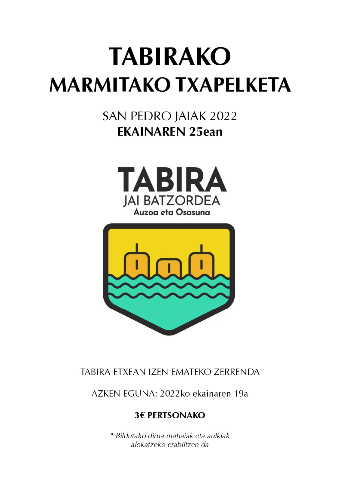 DURANGO | En breve se conocerá la programación de las fiestas de San Pedro de tabira. Pero previo a concoer los datos, los organizadores han abierto el plazo de inscripción del concurso de marmitako que se celebrará el 25 de junio. Las personas interesadas deben dar su nombre en Tabira Etxea. El precio por personas es de 3 euros.