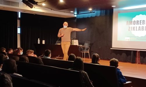 PLAN DE ACCIÓN | Una vez finalizadas las obras de Amorebieta-Etxano Bizikletaz 2022, el plan de acción y la campaña de sensibilización serán claves para que la ciudadanía cambie su forma de moverse y use la bicicleta como su modo de transporte habitual. Esta campaña de acción irá dirigida a toda la población zornotzarra, dividida en diferentes sectores, entre los que se encuentra, el público escolar.  El alumnado reunido en Zelaieta escuchó con atención toda la información y participó activamente en el diagnóstico municipal, con el que seguirá trabajando en próximos encuentros.