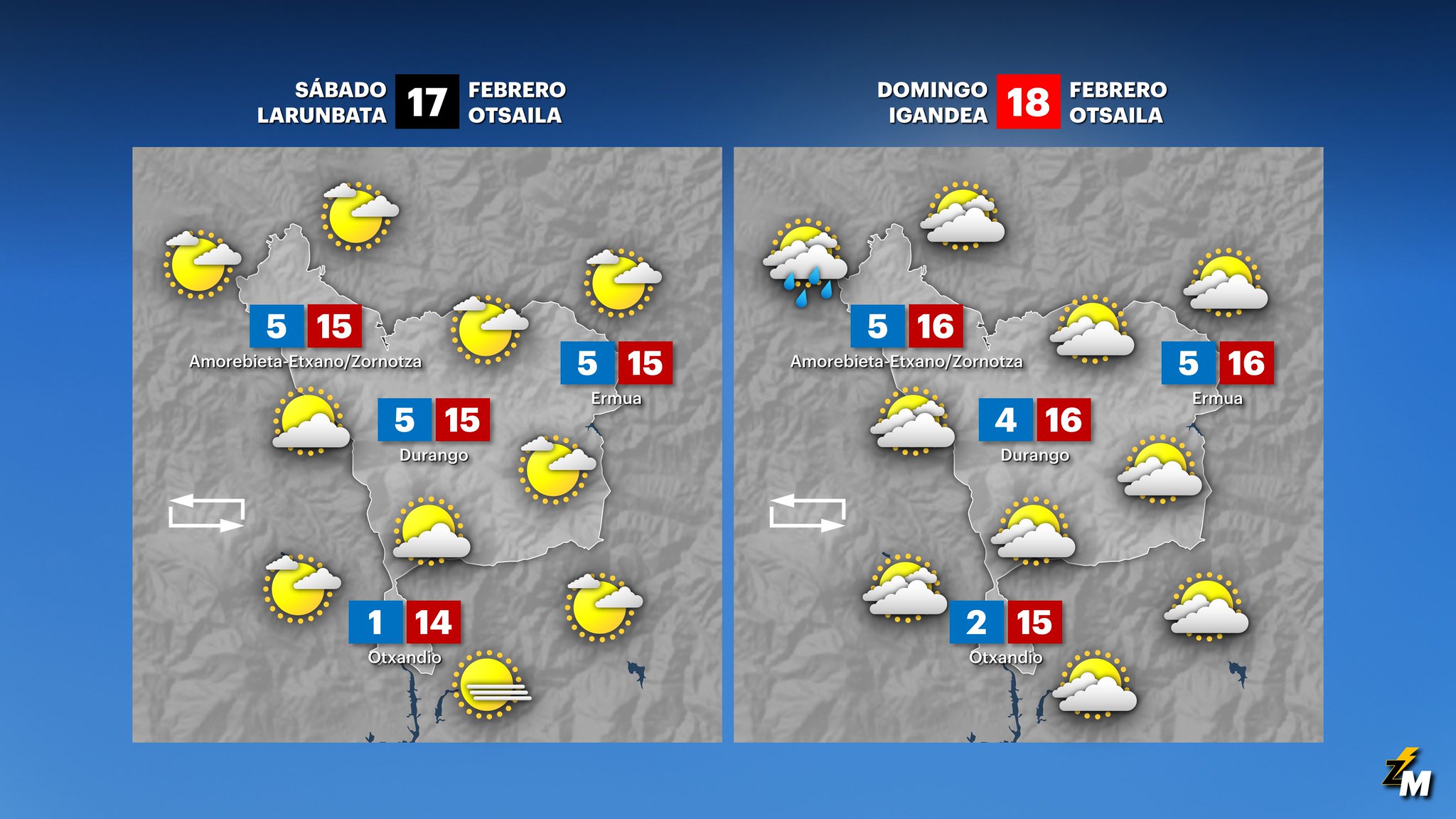 EGURALDIA | El sábado ambiente luminoso. Todavía veremos intervalos de nubes y bancos de niebla a primeras horas, pero el cielo quedará poco nuboso a lo largo del día, con algunas nubes de tipo alto. De madrugada aún se puede escapar alguna gota en el cuadrante nordeste. El viento soplará flojo y variable, con predominio de la componente este en el litoral. Las temperaturas máximas subirán entre 2 y 4 ºC con respecto a las del viernes. Las mínimas bajarán y serán frías en el interior, con alguna helada débil.