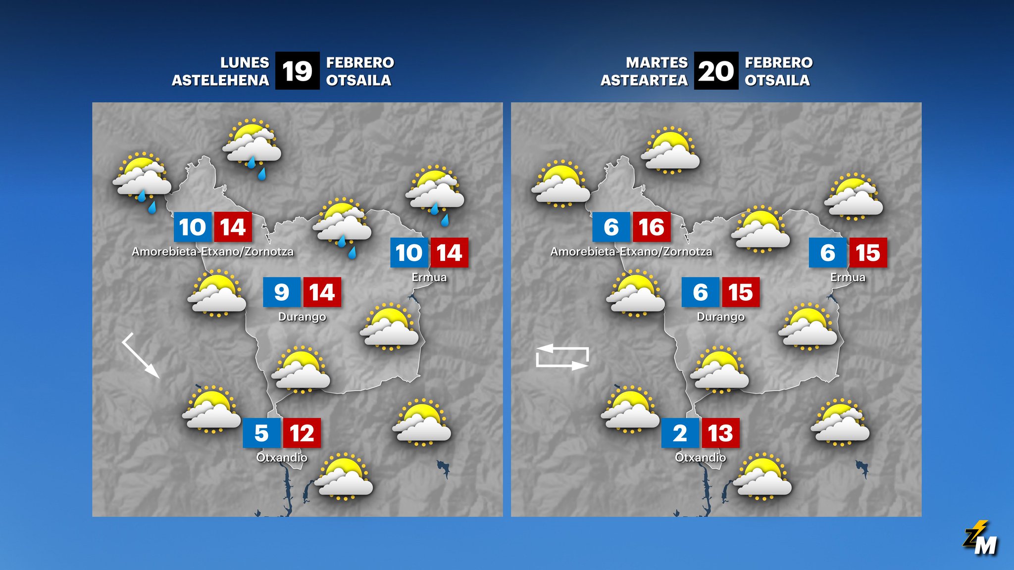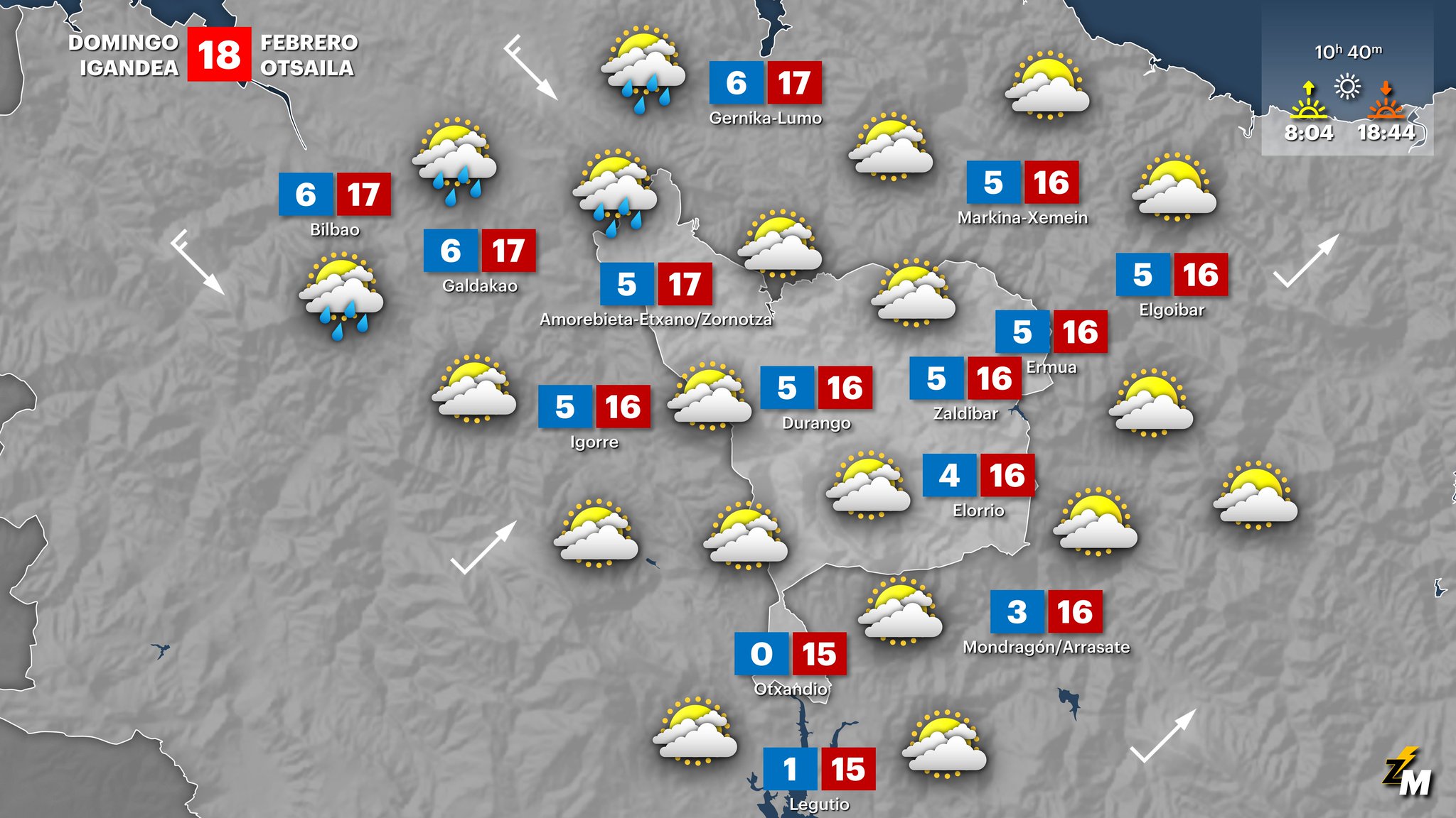 EGURALDIA | El domingo amanecerá un día radiante con algunas nubes altas y brumas a primeras horas. Por la tarde la nubosidad irá a más arrastrada por el viento del noroeste y la lluvia llegará al final del día, extendiéndose durante la noche al resto de regiones. Subirán ligeramente las temperaturas máximas y se repetirán las heladas algunos puntos.