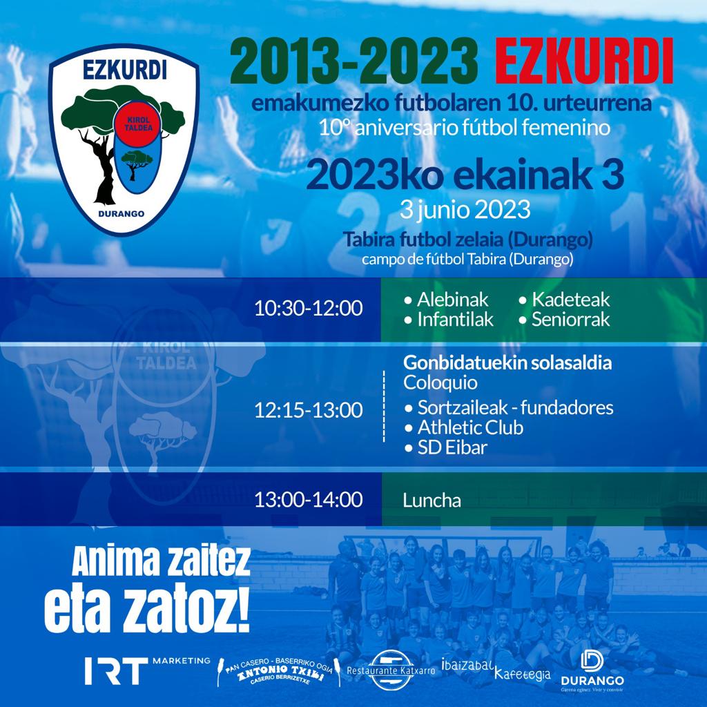 FÚTBOL | Todo listo para que el Ezkurdi Kirol Taldea conmemore el décimo aniversario de su sección femenina. Desde las 10.00 horas y hasta las 12.15 horas en Tabira, se sucederán diferentes partidos en categoría alevín, infantil, cadete y senior, terminando con encuentro entre las vejas glorias del club y las actuales futbolistas.