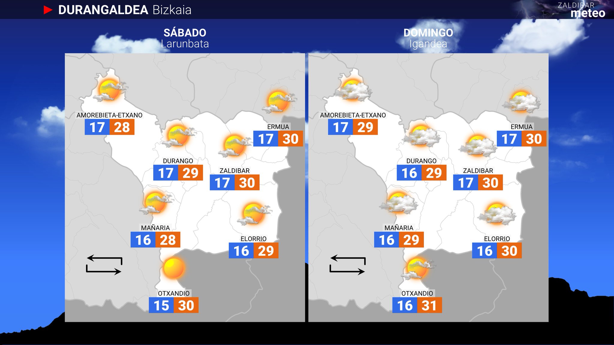 DOMINGO | El domingo disfrutaremos de una jornada soleada con algo más de calor. La nubosidad será escasa durante la mañana. Durante la tarde aparecerán nubes de evolución, que podrían derivar en alguna tormenta al final del día en zonas del interior. Los vientos de componente norte mantendrán las temperaturas por debajo de los 30 °C en la zona costera, pero no impedirán que en el resto de comarcas suban un poco más y se supere dicha cifra.