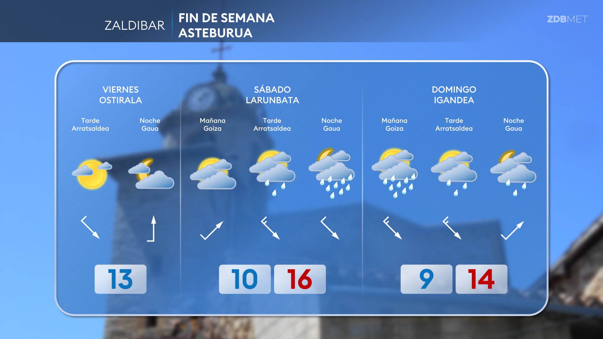 EGURALDIA | El fin de semana se presenta bastante otoñal, con claros, ambiente gris y algunas lluvias. Además, las temperaturas serán más frescas, en torno a 19 grados hoy y mañana, y máximas de 16 el próximo domingo.