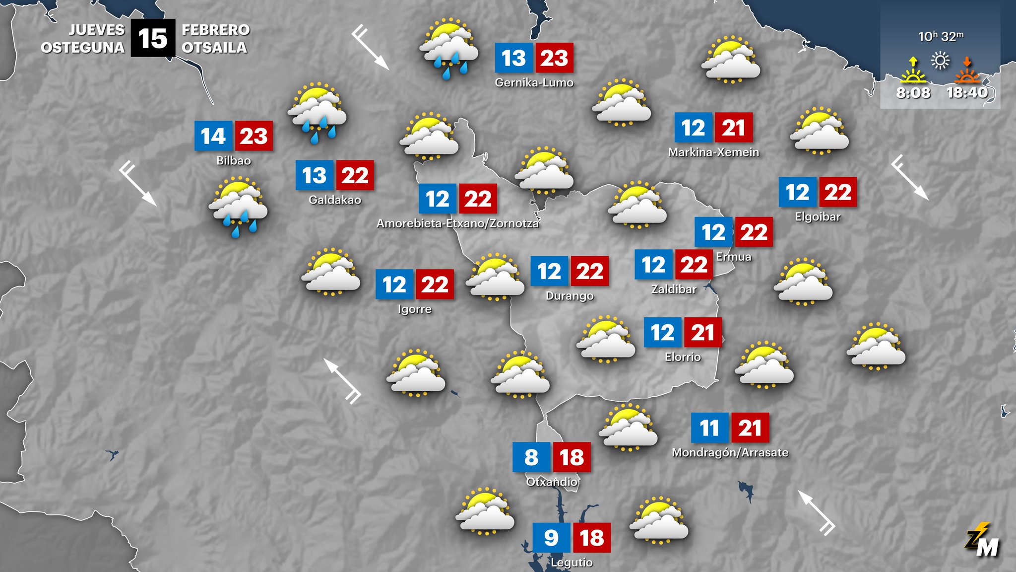 EGURALDIA | El jueves los cambios más significativos llegarán a partir de media tarde. Durante la mañana y primeras horas de la tarde seguirá soplando viento de componente sur y las temperaturas máximas se mantendrán sin cambios respecto a las dos jornadas anteriores. La diferencia principal con las jornadas precedentes será la nubosidad, que aumentará, con nubes medias y altas que apenas dejarán asomar algunos claros; no descartamos algunas gotas dispersas por la mañana. A partir de media o final de la tarde los cambios serán significativos; el viento girará a oeste-noroeste, las temperaturas bajarán, los cielos terminarán por cubrirse y se registrarán precipitaciones, que serán bastante generalizadas por la noche.