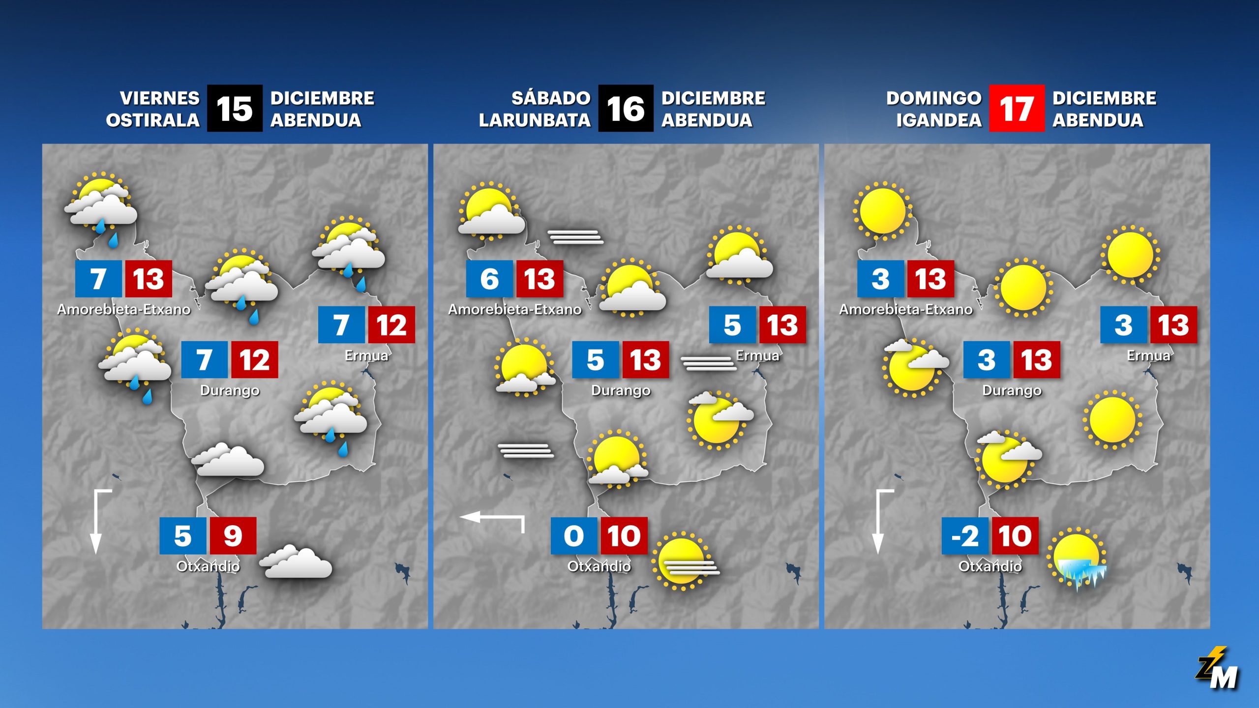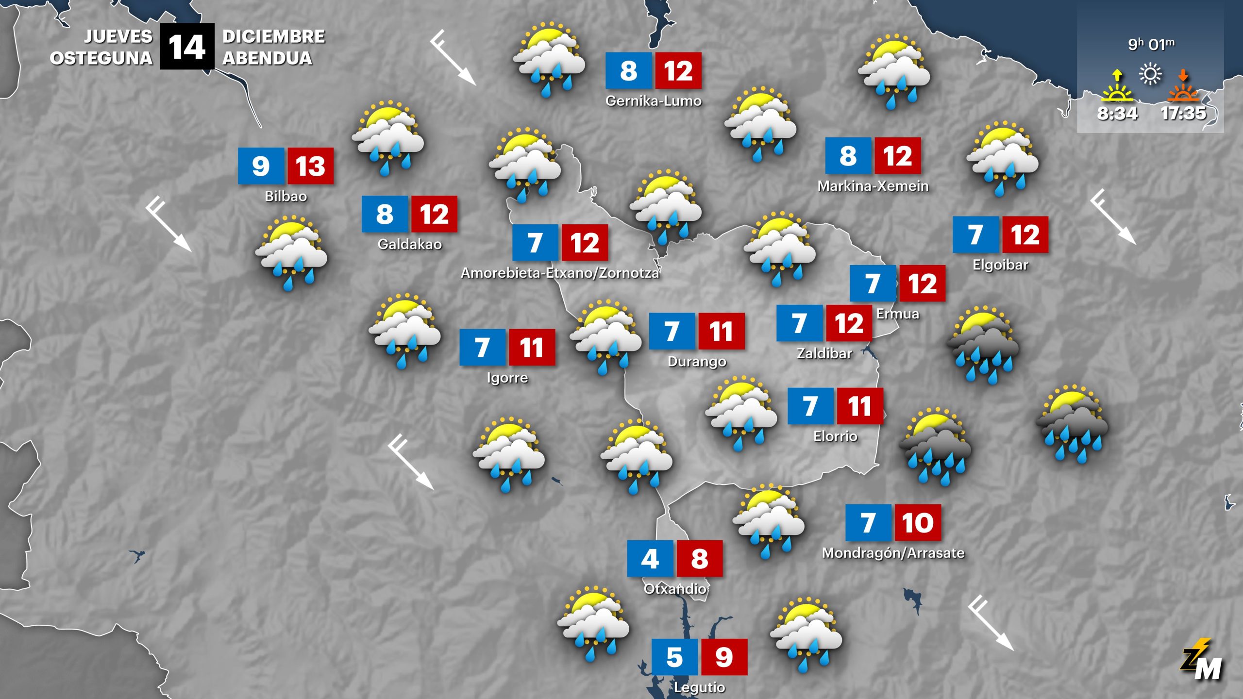 EGURALDIA | El jueves el tiempo seguirá por parecidos derroteros. El cielo estará nublado y se producirán chubascos, en algunos momentos lloverá de forma frecuente e intensa. Las temperaturas volverán a bajar, con unas máximas entre los 8 y los 12 grados y la cota de nieve estará entre los 1300 y los 1500 metros. Viento del noroeste, intenso todavía durante la primera mitad del día.