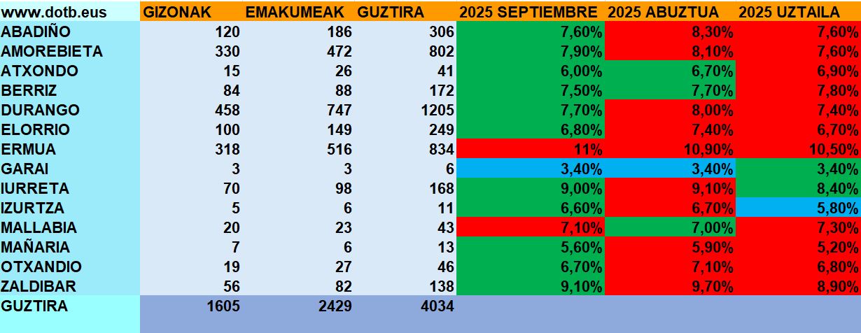 Los porcentajes de paro correspondientes a septiembre, agosto y julio de 2025 muestran una importante variación entre municipios. Ermua destaca por su alta tasa en septiembre, alcanzando el 11%, y permaneciendo en valores elevados en los meses siguientes. Por el contrario, Garai mantiene apenas un 3,4% sostenido todos los meses, mostrando una estabilidad poco habitual en la comarca. Otro ejemplo de descenso notable es Izurtza, que en julio marcó un 5,8%, dos puntos por debajo del resto del año. Así baja el porcentaje en todas las localidades, menos en Ermua y Mallabia, mientras que Garai permanece con el 3,40%.