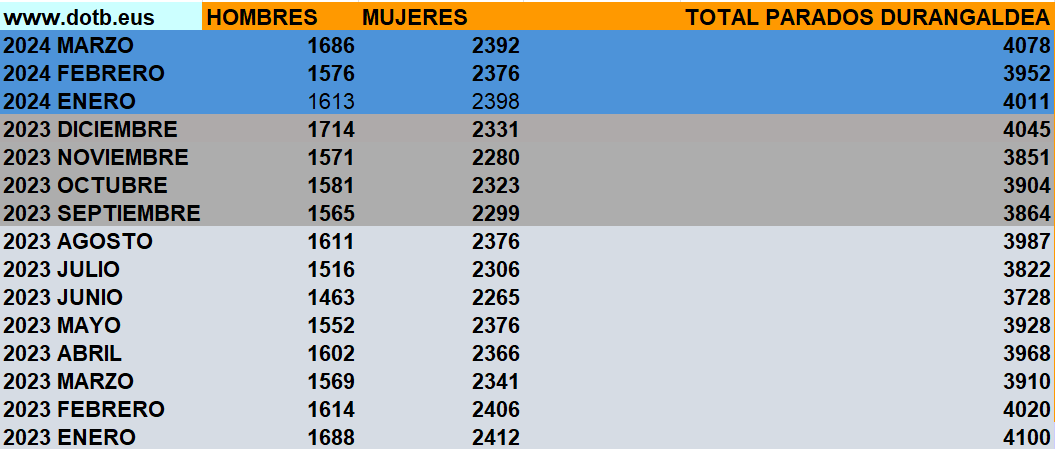DURANGALDEA | Los datos del tercer mes del año no se han sido positivos en Durangaldea. Después de mantenerse por debajo de los 4.000 desempleados durante febrero, el mes pasado volvió a superar ese límite, después de que 126 personas hayan vuelto a las listas de Lanbide. Así de las catorce localidades, en seis la tasa ha subido, en cinco ha bajado y en otras tres se ha mantenido.