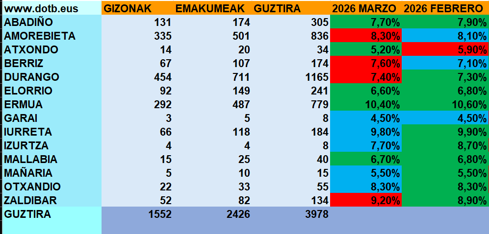 - Zaldibar: pasa del 8,9% al 9,2%, uno de los mayores incrementos relativos.