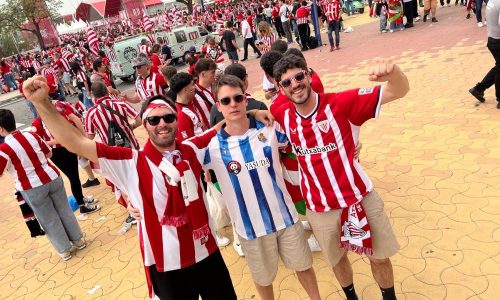 Al principio Jon paso mucha vergüenza pero poco a poco se lo paso genial. La gente le vacilaba y le felicitaba. Fue muy divertido cuando alguien le vacilaba Jon señalaba el parche de la champions de la camiseta. Incluso nos encontramos con aficionados de la Real. Nos hubiera gustado conseguir entradas pero éramos muchos y lo importante era vivir la experiencia juntos. Minutos antes de empezar la final de Copa le entregamos un regalo de su novia Leire: la camiseta auténtica del Athletic.
