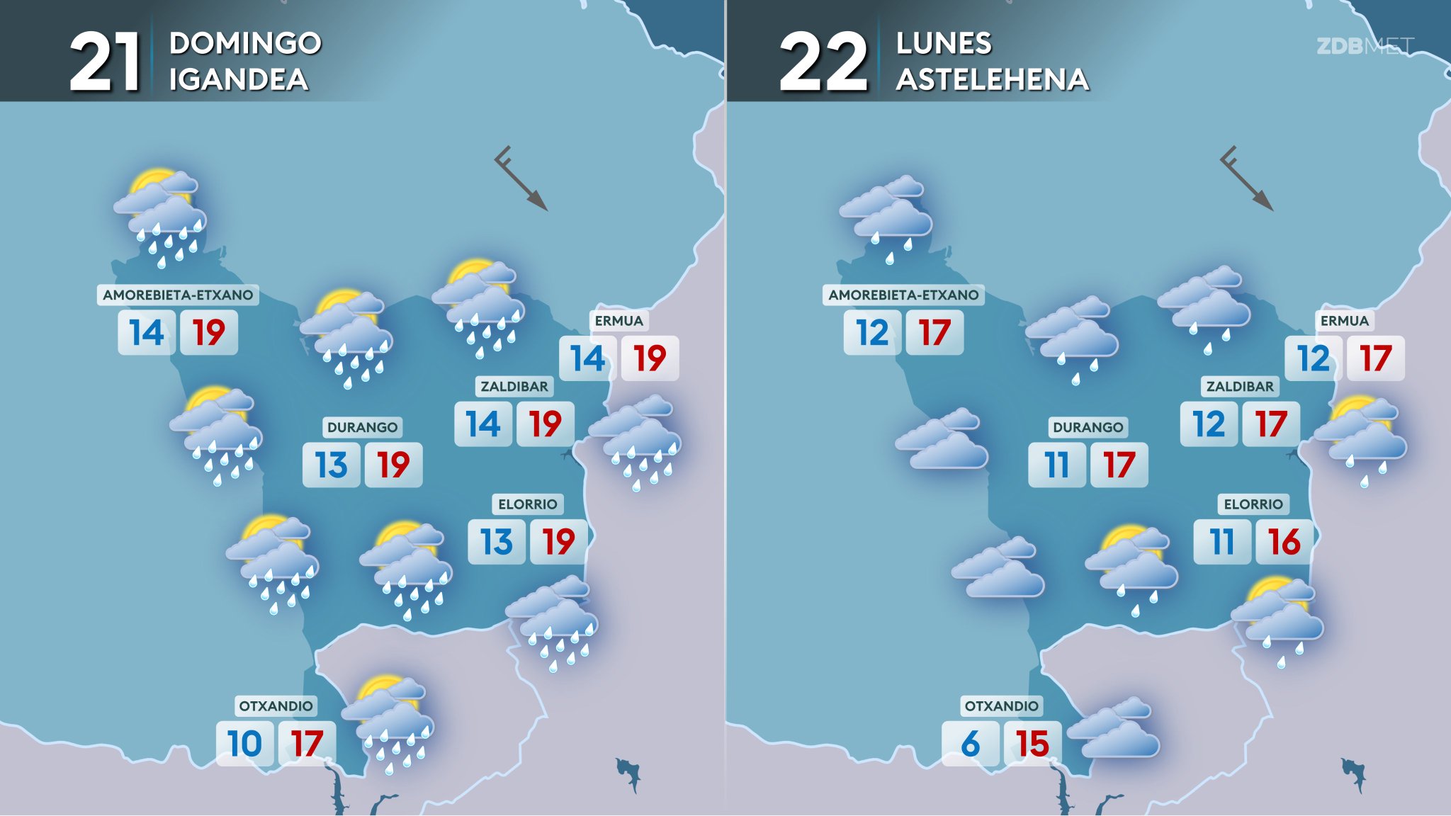 EGURALDIA | El sábado por la mañana el tiempo será tranquilo, y salvo algún chubasco de madrugada, no esperamos lluvia; en el cielo se alternarán las nubes medias y altas. Las temperaturas serán altas desde primeras horas del día debido al viento sur, aunque las máximas se quedarán probablemente por debajo de los 30 ºC en la mayor parte de la región, ya que a durante la mañana el viento irá girando al norte en la costa, y por la tarde en el interior. Tras el giro del viento, se irá nublando y por la tarde-noche se esperan chubascos, que pueden ser tormentosos e intensos; no se descarta alguna granizada. También descenderán las temperaturas y las mínimas del día se registrarán a últimas horas.