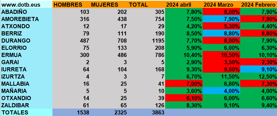 DURANGALDEA | La comarca cierra abril con datos muy positivos con respecto a la tasa de desempleo. El número de mujees baja en todas las localidades, salvo en Mallabia y Otxandio donde sube muy ligeramente. Al cierre del mes pasado, según los datos publicados esta semana por Lanbide, hay 3863 personas desempleadas, 215 personas menos que en marzo, logrando registro similares a los de noviembre de 2023.