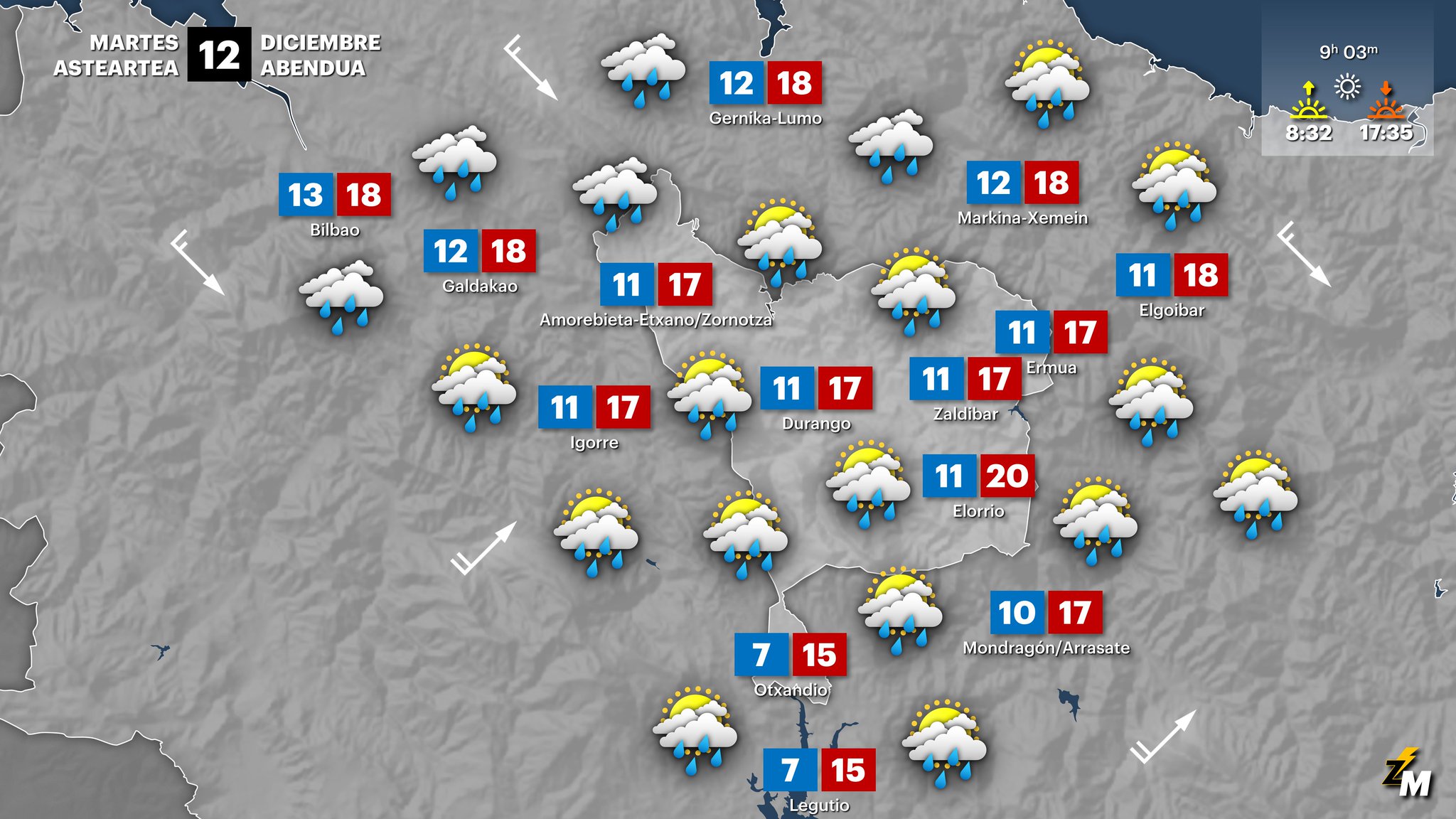 EGURALDIA | El martes tendremos cambio de tiempo con el paso de las horas. De madrugada y primeras horas seguiremos en la misma tónica, con viento del suroeste algo intenso y temperaturas templadas. Durante la mañana, esperamos un aumento paulatino de la nubosidad y, en las horas centrales del día, el viento se fijará del oeste, los cielos se cubrirán y comenzará a llover. Las temperaturas tenderán a bajar.