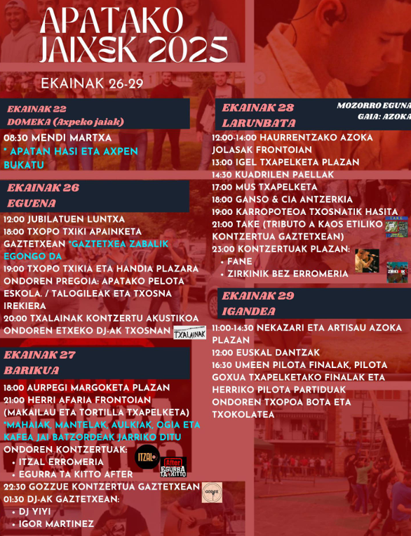 ATXONDO | Nada más terminar las fiestas de Axpe, este jueves comenzarán las de San Pedro en Apata. El 26 de junio alzarán los tradicionales txopos, el grande y el pequeño, y habrá un puesto de Talogileak al lado de la plaza. Este año, el pregón correrá a cargo de la Escuela de Pelota de Atxondo, como reconocimiento a su labor para revitalizar este deporte entre los niños y niñas del pueblo. La pelota también será protagonista el último día de fiestas, ya que se disputarán las finales del Campeonato de Pelota Goxua, que se ha organizado por primera vez y tendrá lugar en el frontón de Apata. Dentro del mismo festival también se jugarán partidos de pelota infantil.