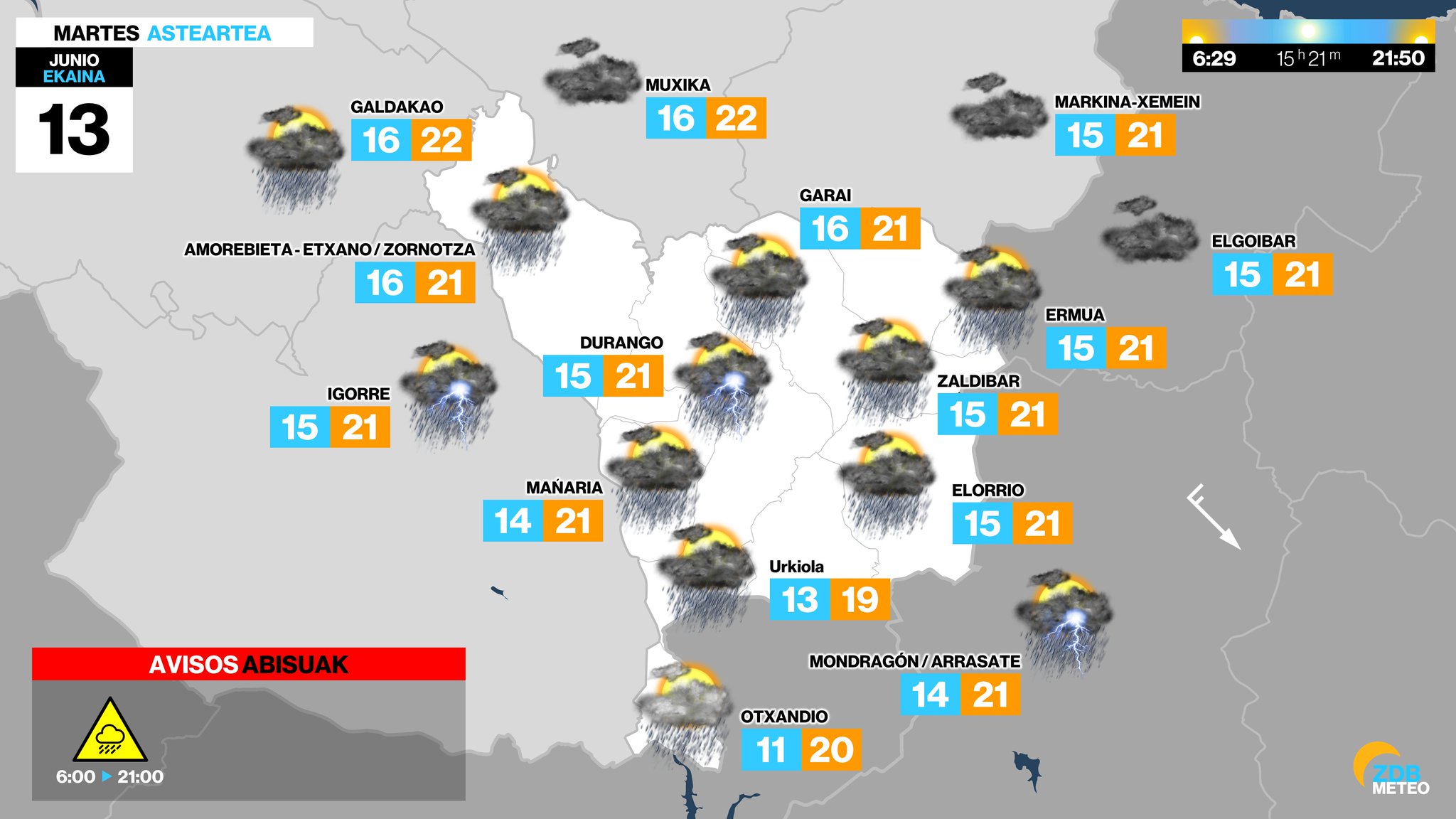 EGURALDIA | La lluvia ganará protagonismo hoy martes. Euskalmet ha activado la alerta amarilla desde las seis de la mañana hasta las nueve de la noche. Se pueden acumular hasta 15 litros por metro cuadrado en una hora con precipitaciones que en ocasiones podrían ser tormentosas. Ya desde la mañana se podrán registrar algunos chubascos que se prolongarán durante la tarde, acompañados de tormenta en ocasiones. La abundante nubosidad junto con el viento del noroeste, a veces intenso, provocarán un desplome de las temperaturas.