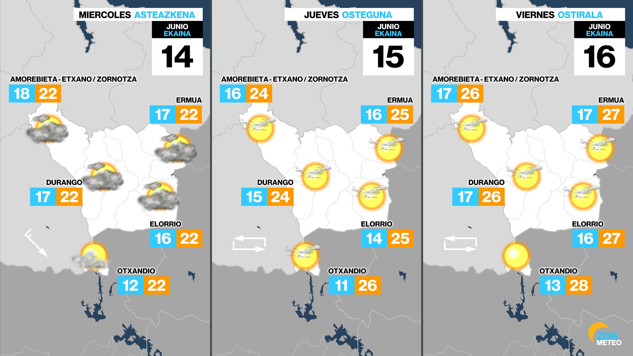 El miércoles poco a poco el tiempo se tranquilizará. Aun así, lloverá durante la mañana, siendo las precipitaciones más abundantes en el este. Por la tarde ya solo quedarán algunos reductos de precipitación en Iparralde. Las temperaturas máximas subirán ligeramente.
