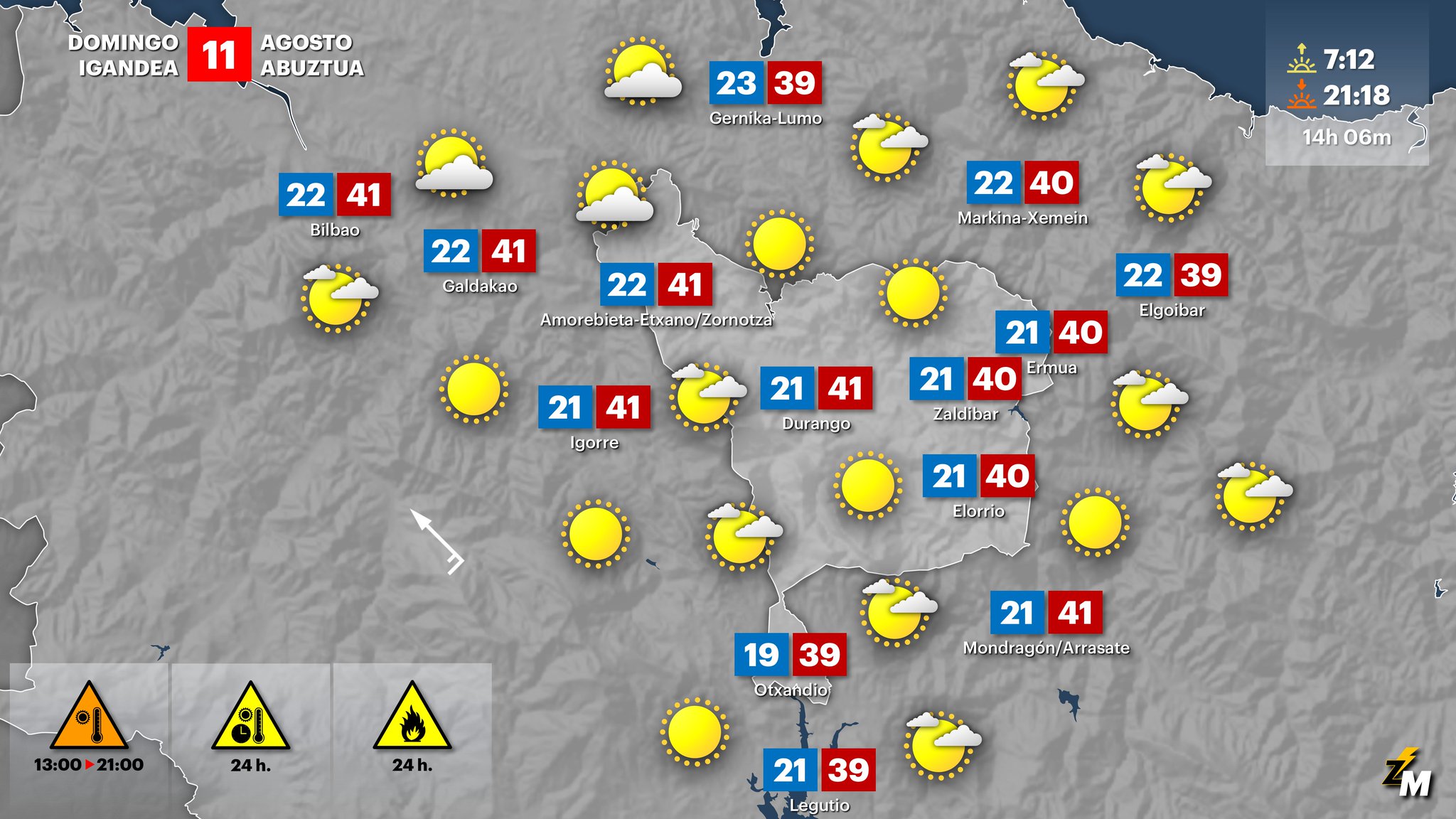 EGURALDIA | Hoy podrá ser uno de los días mas calurosos del verano. Si ayer se activaban los avisos amarillos por temperaturas que superaban los 30 grados, para hoy domingo se activarán el naranja, por Euskalmet, y el rojo por AEMET- Agencia Española de Meteorología-. El mercurio se situará cerca de los 40 grados o en algunos puntos de Durangaldea incluso se superará esa marca.