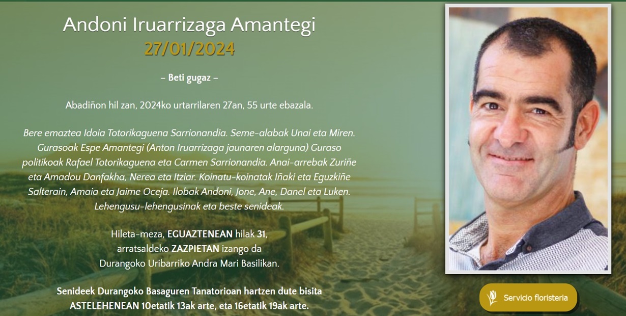 «Día triste hoy para todos los alderdike, alderdizale y durangarras. Aún no habíamos secado las lágrimas, tenemos que despedirnos de otro amigo y ex concejal, Andoni Iruarrizaga Amantegi.