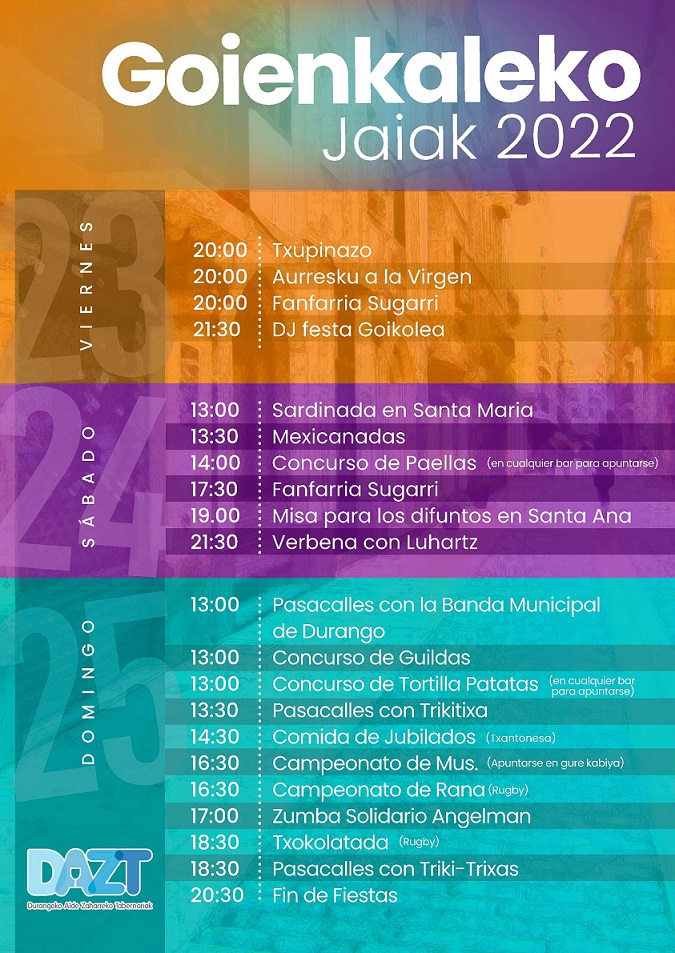 El domingo el pasacalles de la Banda Municipal animará el casco viejo durangarra. A la una de la tarde arrancarán los concursos de gildas y  de tortilla de patatas -apuntarse en cualquier bar-. A las 14:30 horas tendrá lugar la comida de los jubilados -apuntarse en la Txantonesa- y tras la misma los campeonatos de mus y rana. A las 17.00 se celebrará un festival de zumba con fines benéficos. Todo lo recaudado será para la asociación de Angelman.