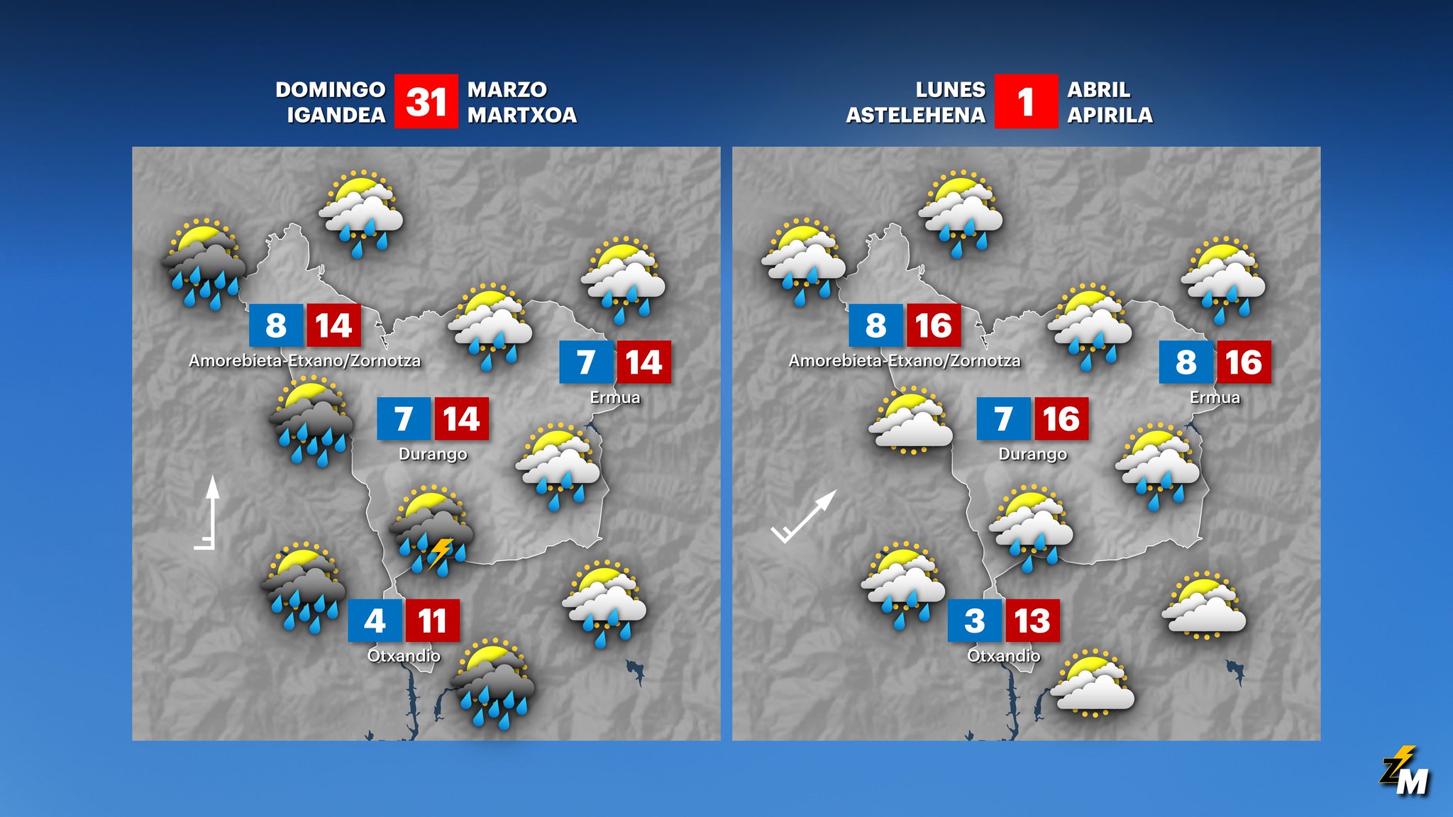 EGURALDIA | El domingo las nubes irán a más y lloverá. A primeras horas el ambiente será tranquilo, incluso con amplios claro en el cielo. A lo largo de la mañana, sin embargo, la nubosidad aumentará y comenzando desde el sur, lloverá prácticamente en todo el territorio, sobre todo a partir del mediodía. A últimas horas irá remitiendo. La nieve caerá en cotas superiores a los 1300-1500 metros. El viento soplará del sur e irá perdiendo fuerza en las horas centrales del día, quedando variable e incluso fijándose del oeste-noroeste en la costa por la tarde. Las temperaturas máximas descenderán.