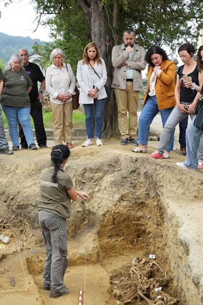 Lourdes Herrasti, responsable de la excavación que lleva a cabo la Sociedad de Ciencias Aranzadi, ha explicado durante la visita los hallazgos realizados durante estos días. Se han encontrado los restos mortales pertenecientes a 11 personas, todos ellos enterrados en una sola fosa, y todos los indicios apuntan a que se trata de restos de personas fallecidas en el hospital de Amorebieta-Etxano durante la guerra. Son resultados preliminares porque, esta tercera campaña de excavación aún no ha finalizado.