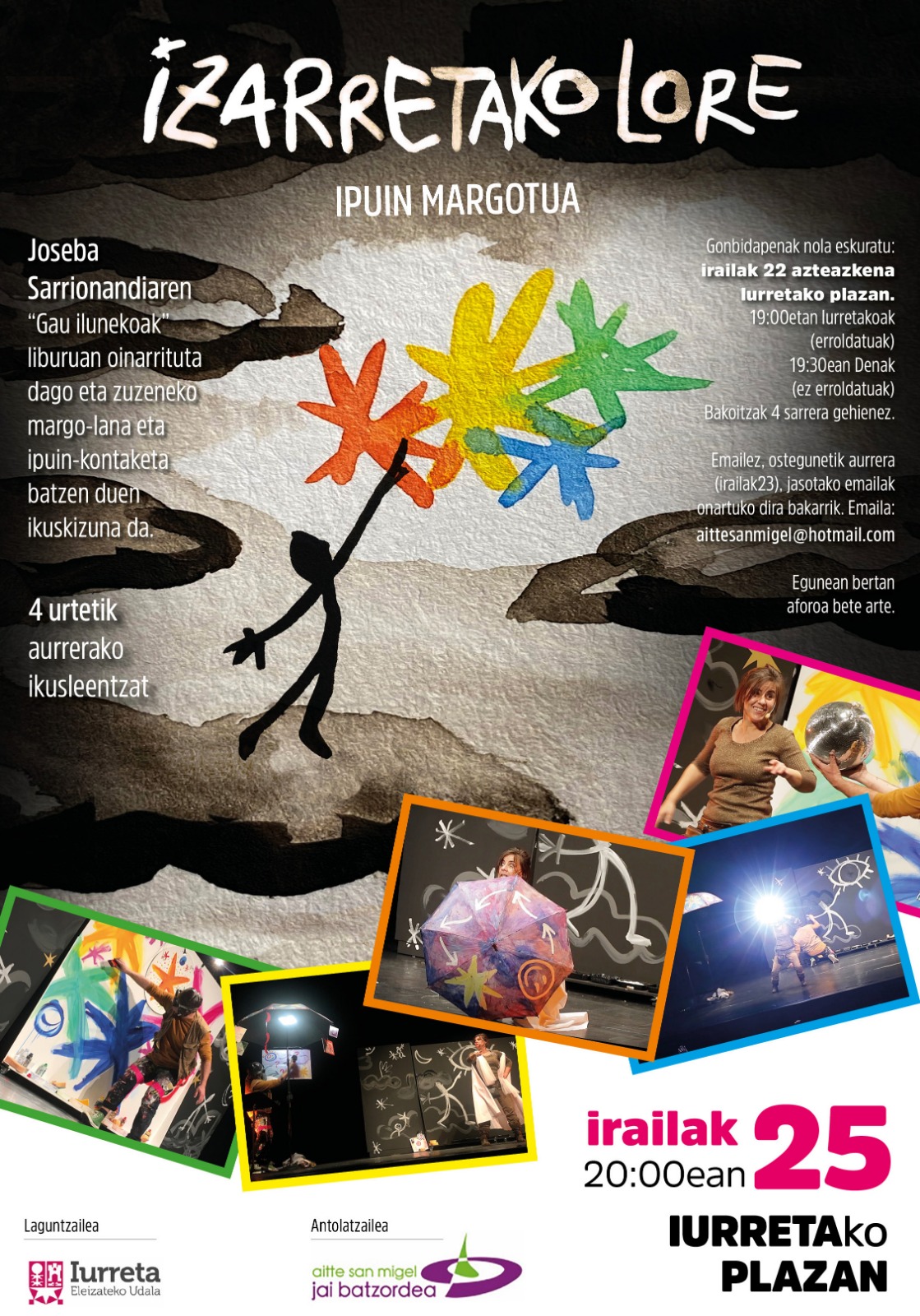 IURRETA.- Por segundo año consecutivo la localidad no tendrá fiestas, pero si una programación cultural que arrancará este sábado con Puro Relajo, a las 19:30 horas. Durante la mañana se podrá visitar también la feria de mujeres creativas y a las 20:00 horas se ha organizado el estreno del teatro «Izarretako lore» basado en el libro «Gau Ilunekoak» de Joseba Sarrionandia.