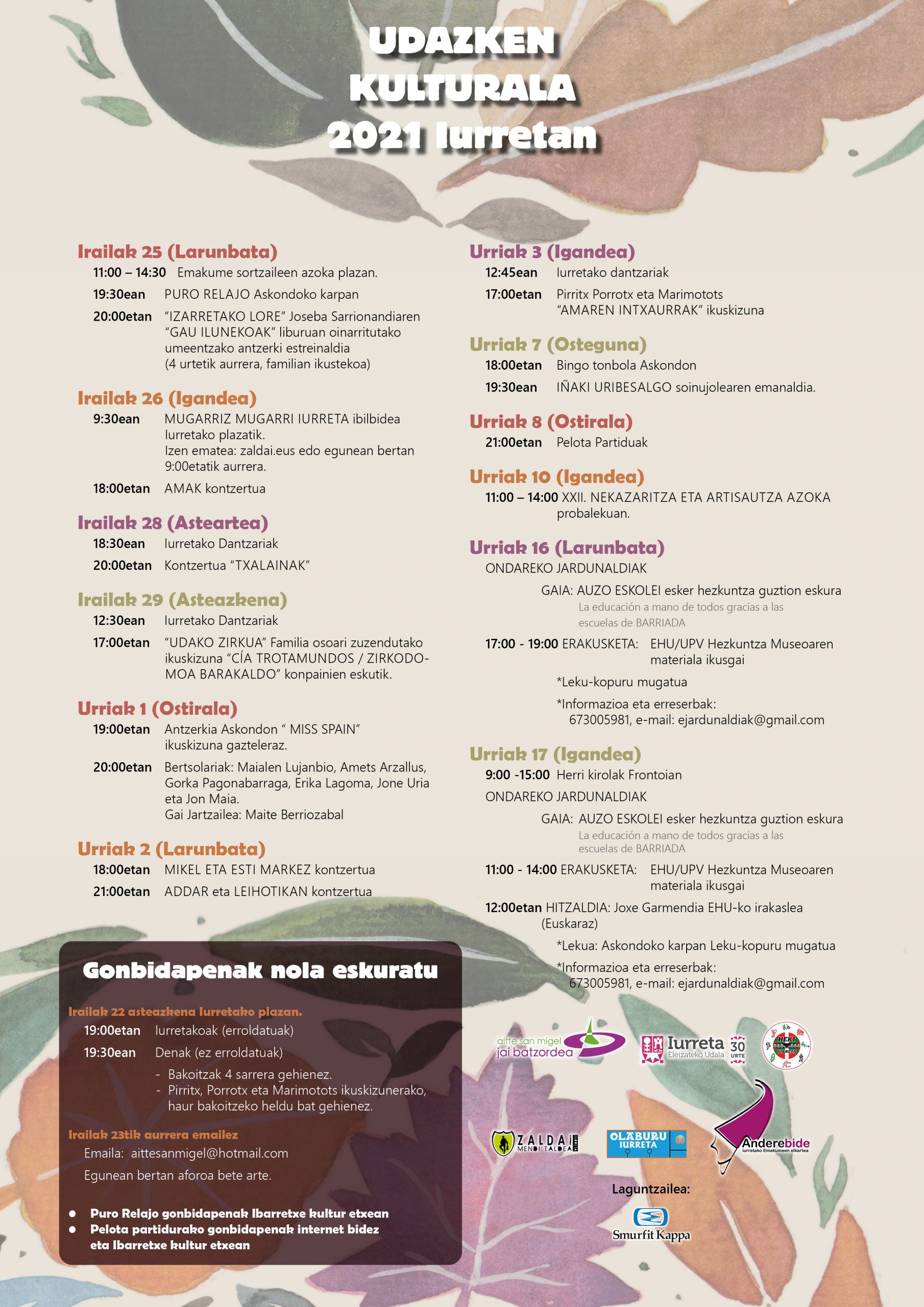 Una extensa programación organizada por el Jai Batzorde iurretarra que se alargará hasta el 17 de octubre. Todas las actividades se desarrollarán en formato reducido, evitando aglomeraciones de personas y aplicando todos los protocolos, medidas y recomendaciones higiénico-sanitarias en vigor con control de aforo, sentados y con inscripción previa.