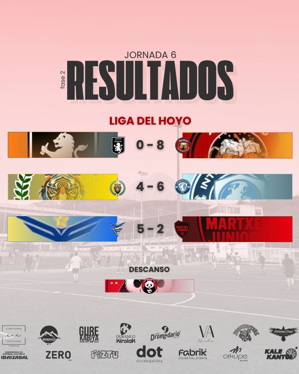 FUTBOL | La Liga del Hoyo sigue su curso en la Kings Durango. Este pasado fin de semana se disputó la jornada 6. De momento, Los Lojanos siguen con paso firme, cuatro de cuatro, y se mantienen líderes tras su triunfo ante Martxel Juniors. En la segunda plaza, triple empate (9 puntos) y todo por decidir. Inter Panda, Internacional y Axpe United de lleno en la pelea. Por otro lado, Martxel, Tigres y Aston Birras, se quedan sin opciones.