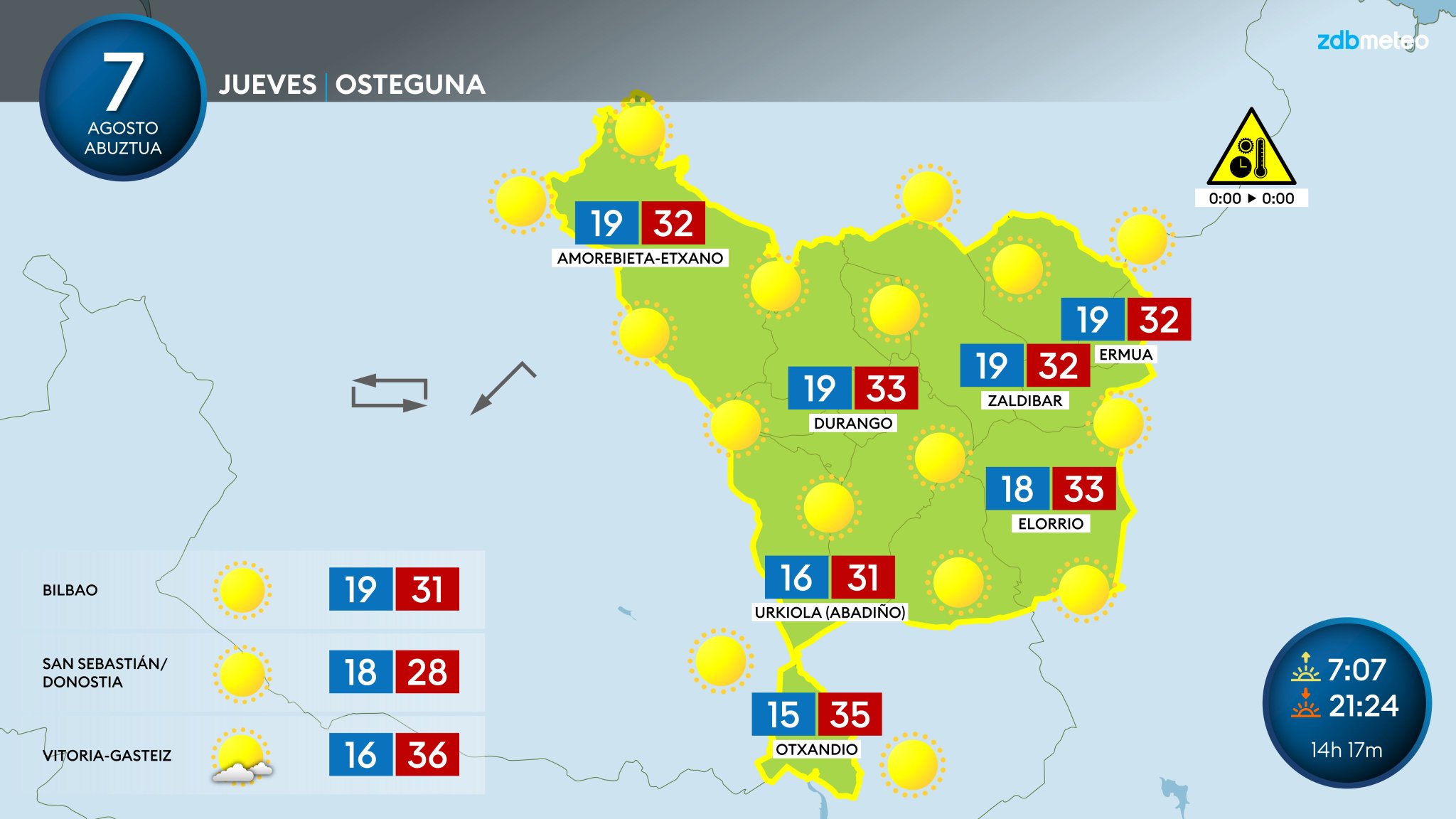 EGURALDIA | El jueves continuará con tiempo veraniego. Subirán algo más las temperaturas, sobre todo en la mitad sur. En el norte predominarán las brisas y ahí la subida será más contenida. En general se superarán los 30 °C, salvo en la franja costera; en el Valle del Ebro las máximas superarán los 35 °C. El cielo estará poco nuboso o despejado a lo largo de la jornada; solo habrá que contar con brumas a primera hora y algunos intervalos de nubes altas.