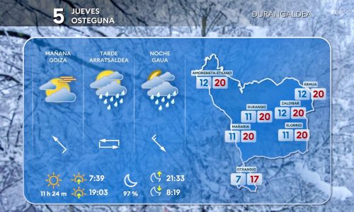 EGURALDIA | Nubes y claros a primeras horas del jueves, con viento sur y sin lluvia. Durante las horas centrales del día, el viento pasará a soplar del norte o del noroeste, empezando por la costa, y la nubosidad irá en aumento. Por la tarde-noche el cielo estará muy nuboso o cubierto y se producirán chubascos ocasionales, que podrían ir acompañados localmente de tormenta. Las temperaturas bajarán durante la segunda mitad del día, pero las máximas serán parecidas a las de días anteriores.