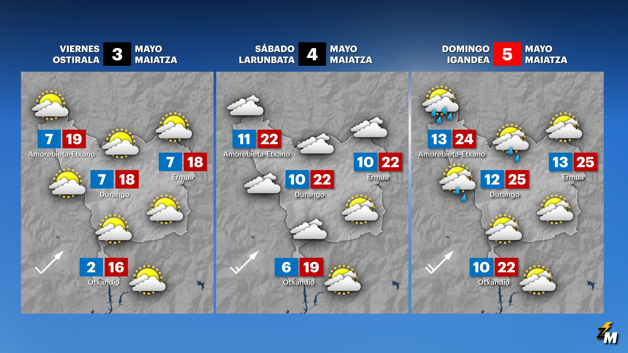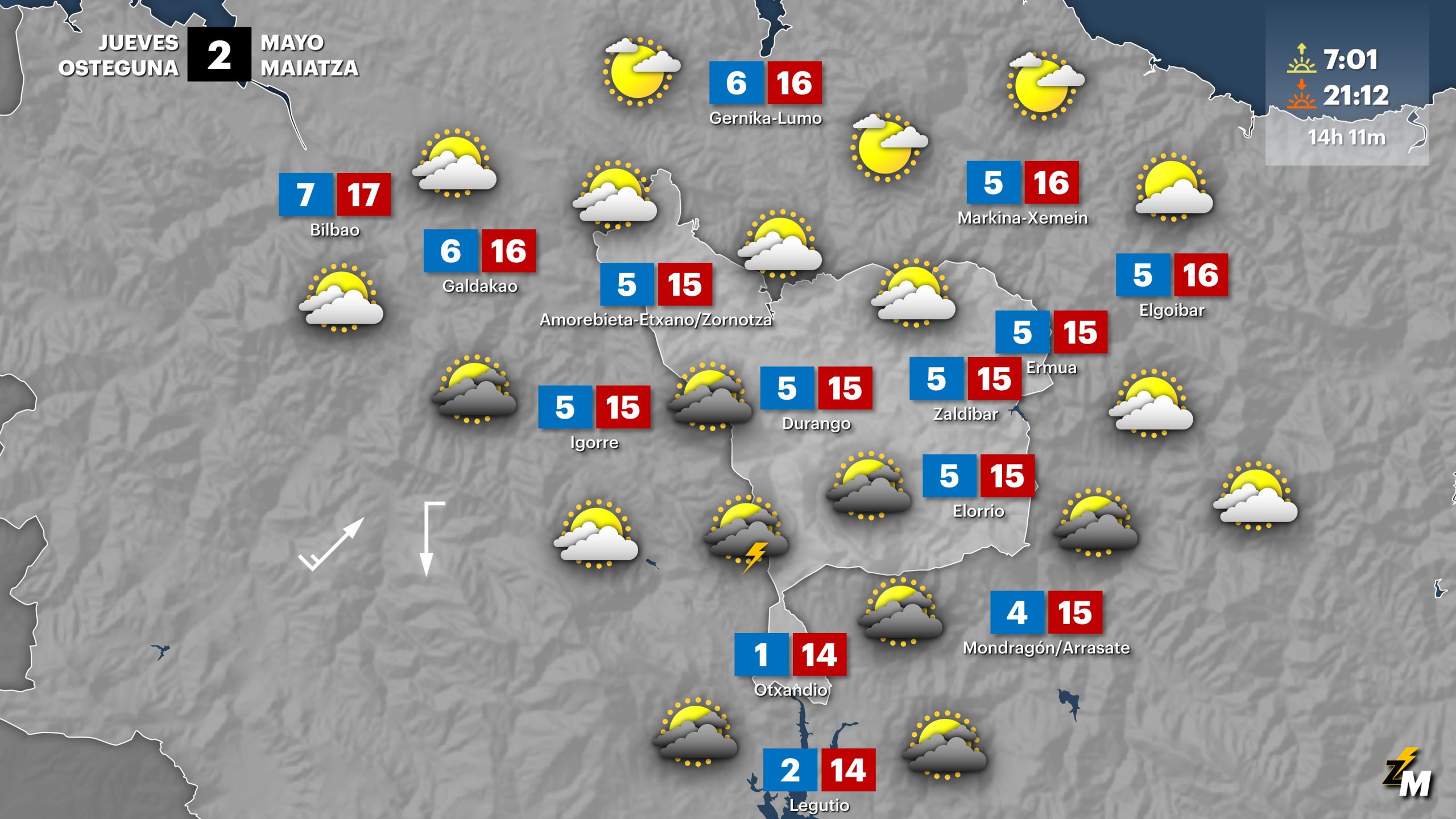 EGURALDIA | Jornada más tranquila el jueves. De madrugada y primeras horas todavía puede llover algo, pero durante la mañana predominarán los claros y el ambiente será soleado. Por la tarde las nubes aumentarán, y pueden producirse algunos chubascos dispersos, más probables en el interior. La mañana será fría y podrá helar en algunas zonas. Las temperaturas máximas recuperarán parte de lo perdido en la jornada anterior.